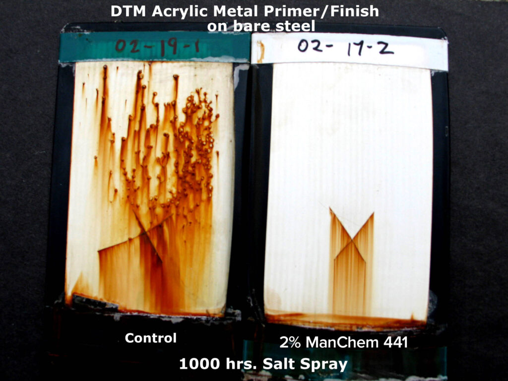 The panel on the left is a commercially available direct-to-metal acrylic primer/finish applied to bare steel. The panel on the right is the same primer/finish with Manchem 441 adhesion promoter. After a 1000 hour salt spray test, the coating with Manchem showed no signs of corrosion beyond the scribe while the coating without Manchem exhibited significant corrosion across the entire panel. Click on picture for close-up view.